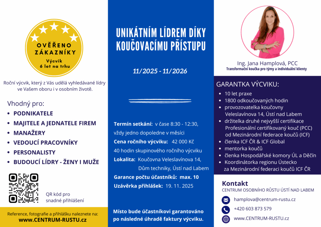 Transformační koučka pro týmy a individuální klienty. Odkoučováno přes 1 700 hodin s klienty.